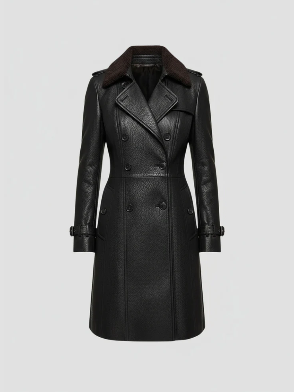 La Valéria encarna el equilibrio perfecto entre autoridad y elegancia. Confeccionada en piel texturizada de alta calidad, esta prenda combina la solidez del diseño estructurado con la suavidad del interior afelpado. Su corte entallado y el doble abotonado realzan la silueta femenina, mientras que los detalles en los puños y el cuello añaden un toque distintivo de refinamiento.