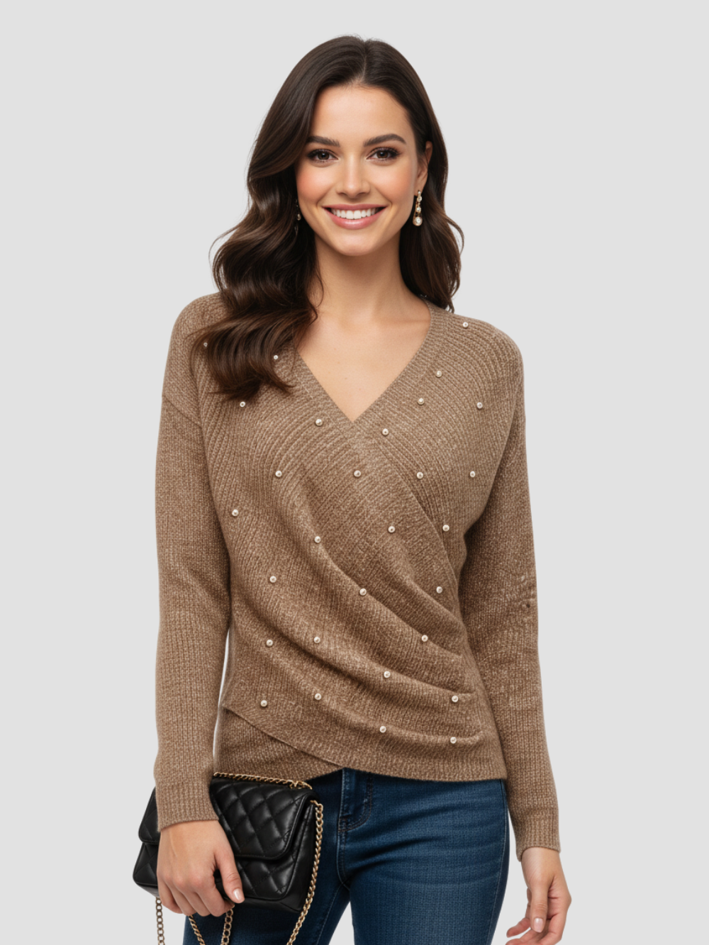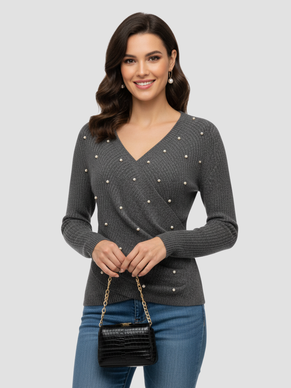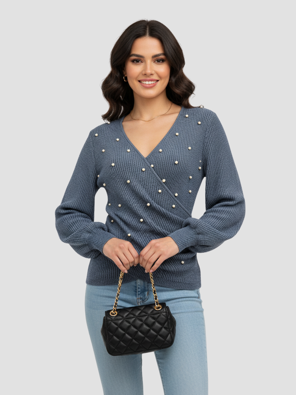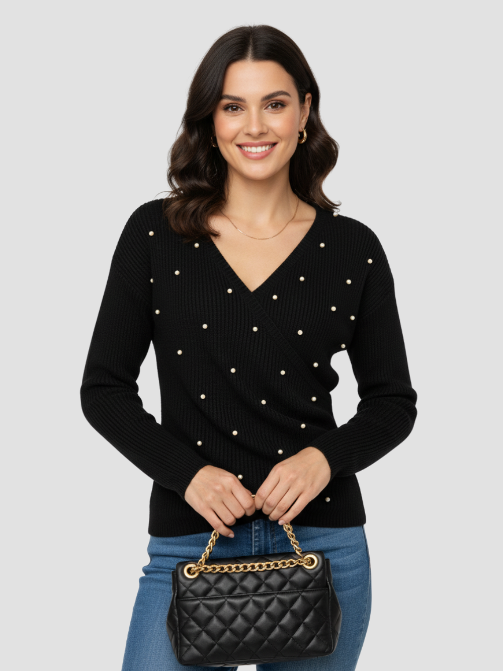 Eleva tu estilo diario con el suéter Marisel con perlas y escote cruzado en V. Diseñado con una silueta envolvente favorecedora, este tejido de manga larga incorpora delicados detalles de perlas que aportan un toque de elegancia clásica. Su tela suave y ajustada se adapta con belleza, creando un sutil fruncido que realza tu figura. Ideal para salidas casuales, cenas o looks elegantes de día a noche, este suéter combina comodidad con un encanto sofisticado.