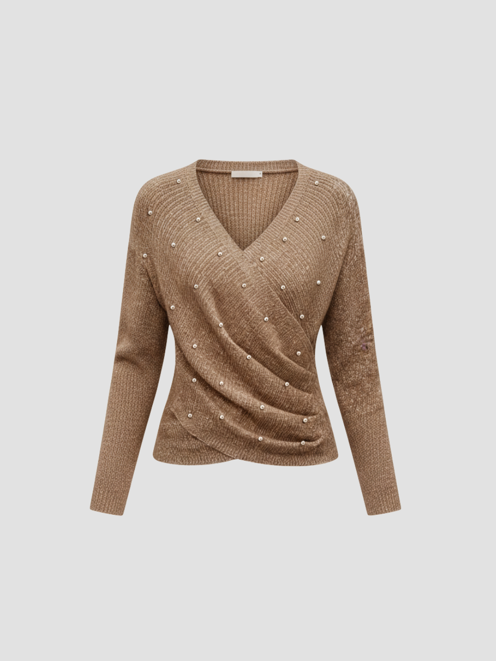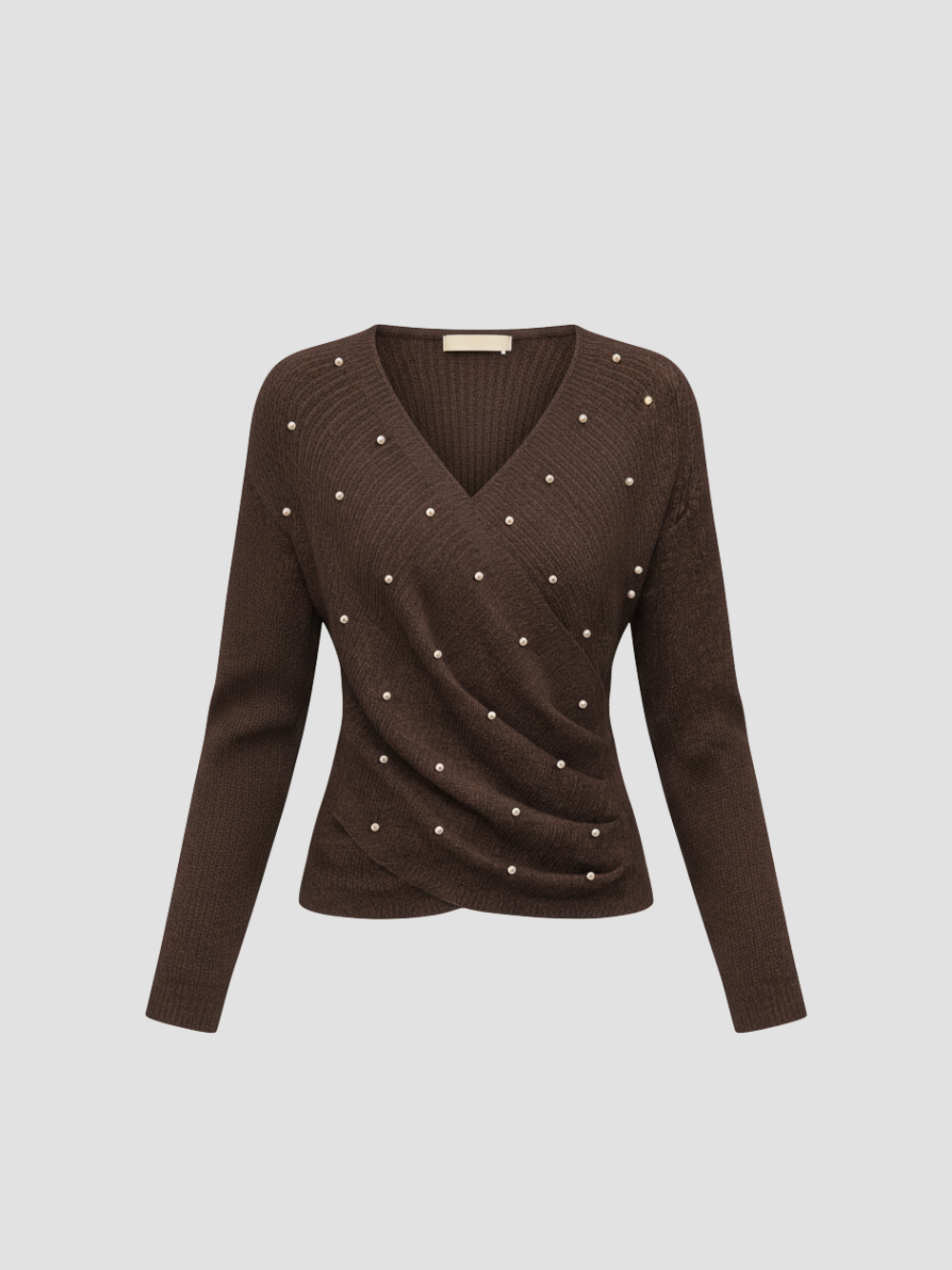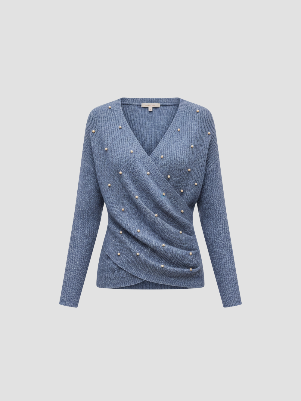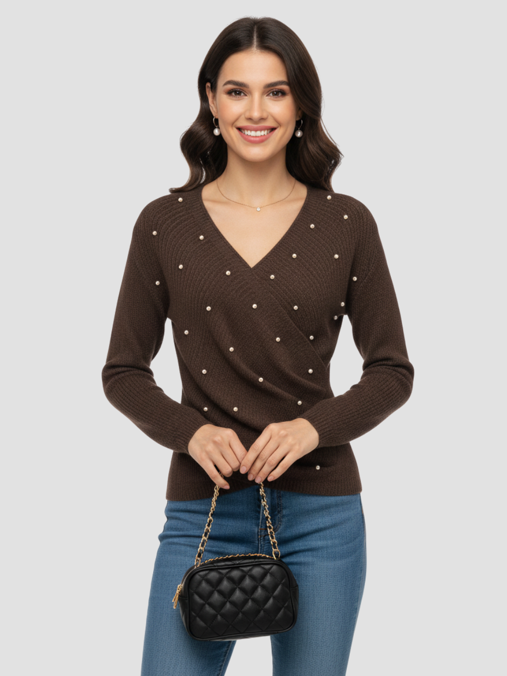 Eleva tu estilo diario con el suéter Marisel con perlas y escote cruzado en V. Diseñado con una silueta envolvente favorecedora, este tejido de manga larga incorpora delicados detalles de perlas que aportan un toque de elegancia clásica. Su tela suave y ajustada se adapta con belleza, creando un sutil fruncido que realza tu figura. Ideal para salidas casuales, cenas o looks elegantes de día a noche, este suéter combina comodidad con un encanto sofisticado.