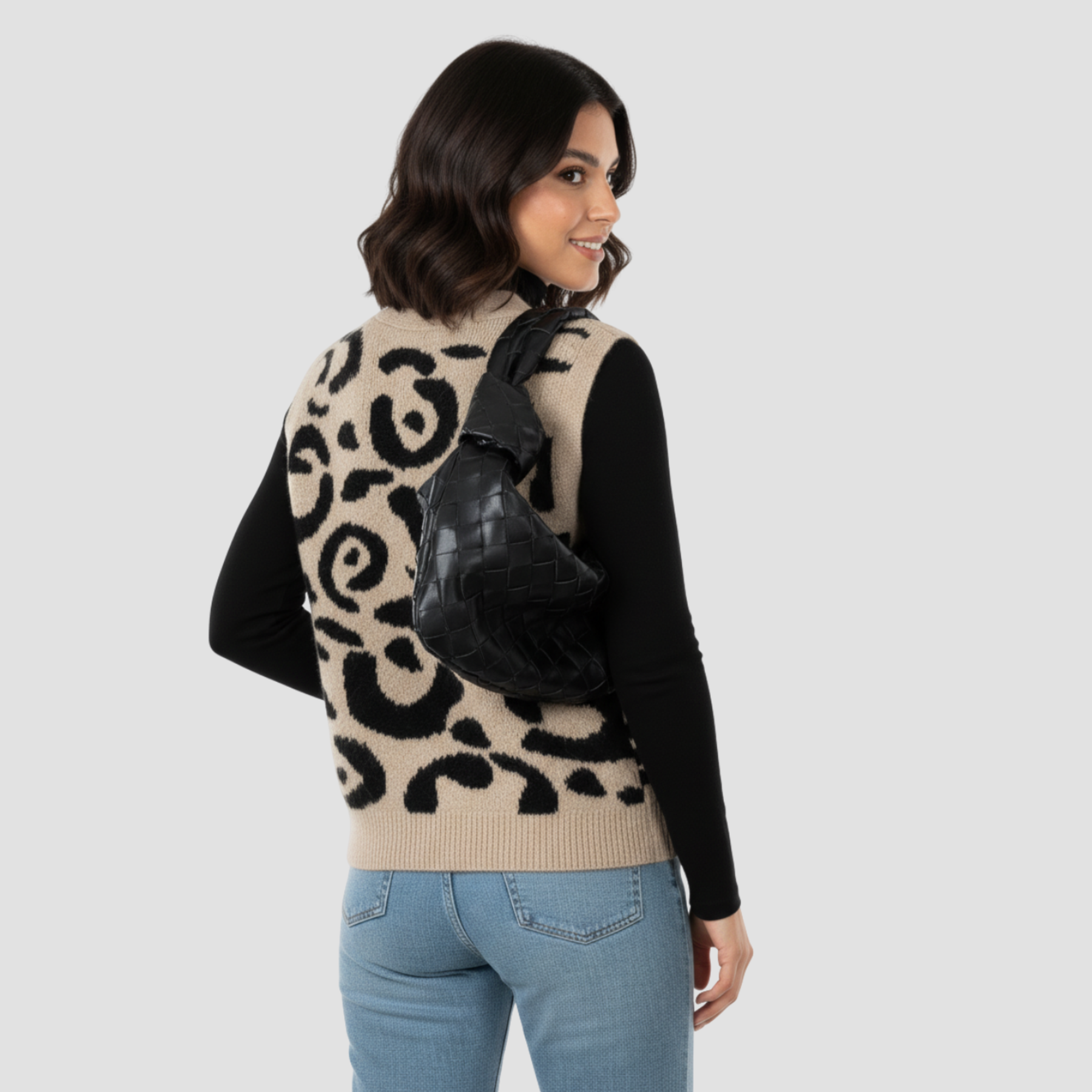 El chaleco LIONNELLE de MANIORÈ reinventa el punto clásico con una estética audaz y sofisticada. Su estampado expresivo y su diseño versátil lo convierten en una pieza clave para elevar looks en capas, desde combinaciones casuales hasta conjuntos más estilizados.