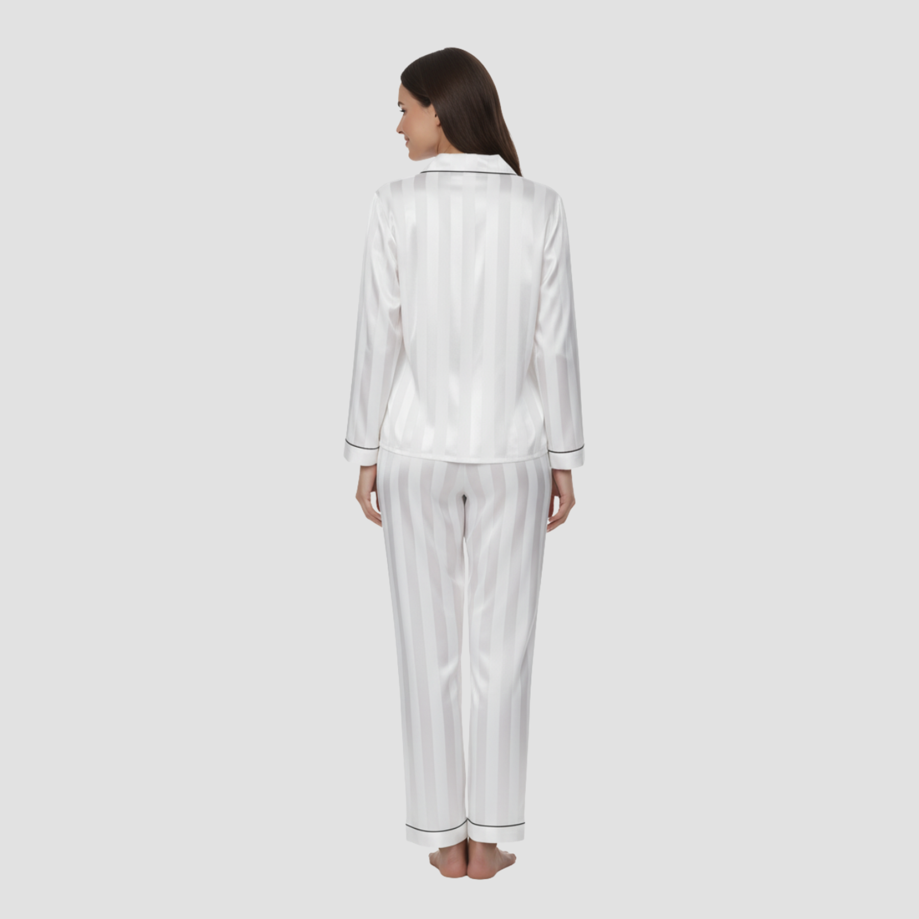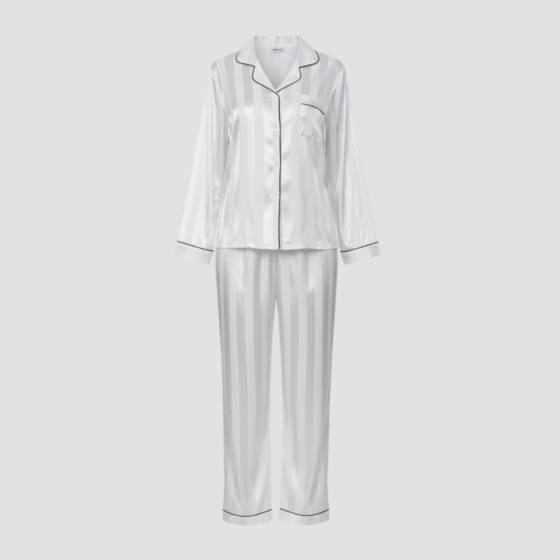 Disfruta de un estilo elevado en casa con el conjunto de pijama Serenique Satin Stripe Luxe. Su satén suave y brillante se desliza con delicadeza sobre la piel, y el elegante diseño de rayas jacquard aporta un toque de sofisticación. Con una blusa entallada de botones y ribete en contraste, junto a un pantalón de pierna recta, este conjunto combina un estilo clásico con una sensación lujosa. Ideal para relajarte con estilo, ya sea por la noche o en tus mañanas tranquilas.