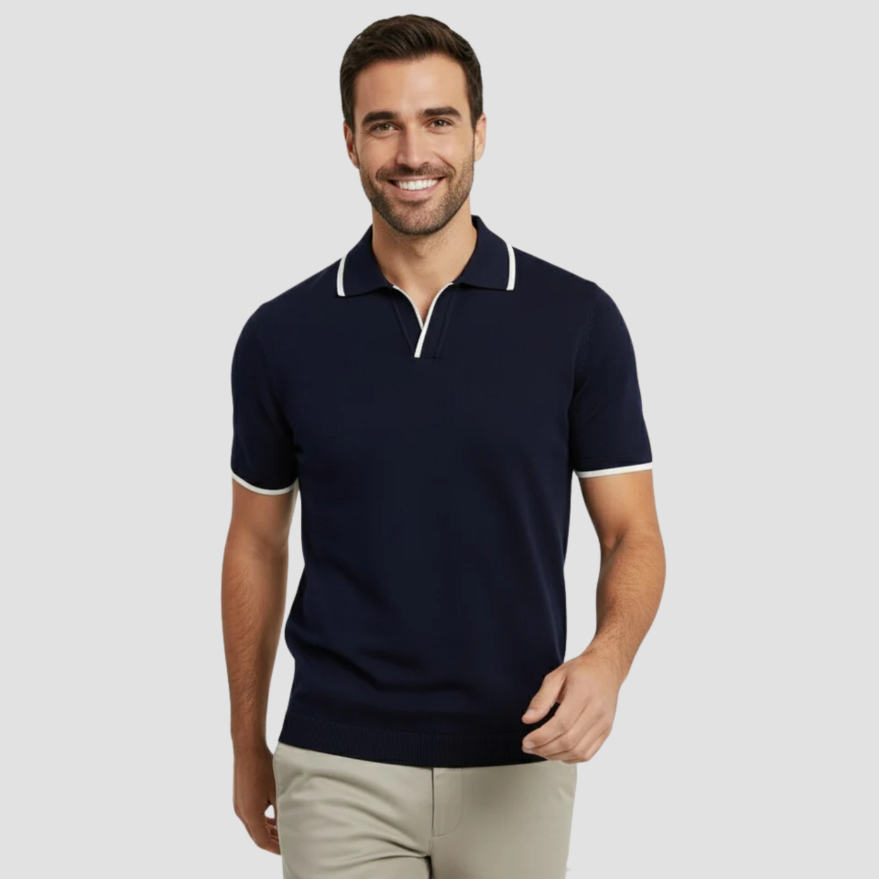 Cuello Abierto con Estilo Deportivo – Sin botones, con una caída natural que sugiere seguridad y distinción.