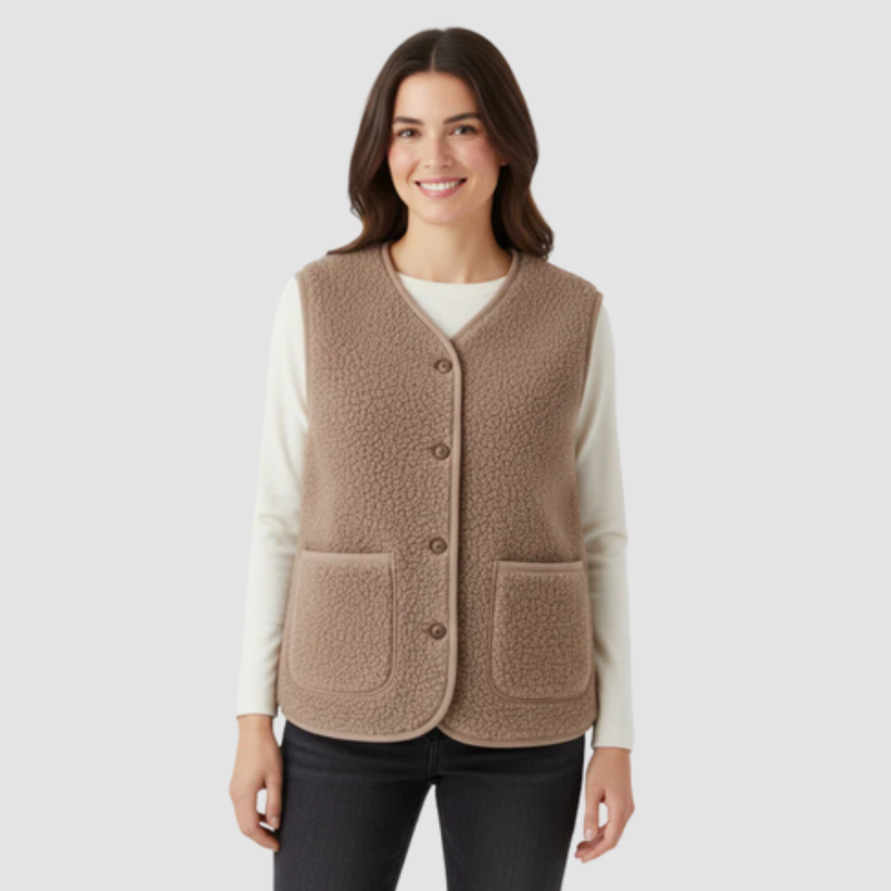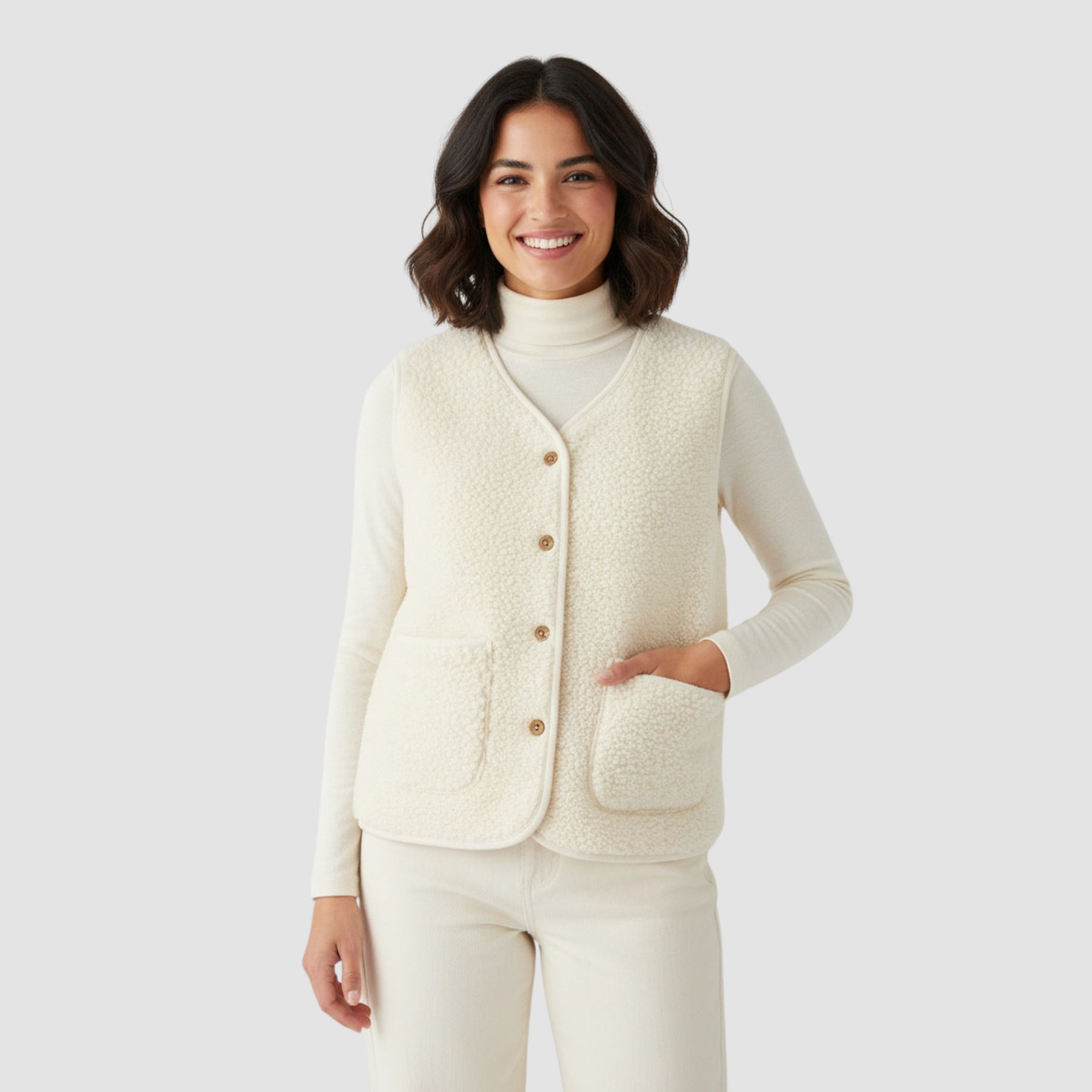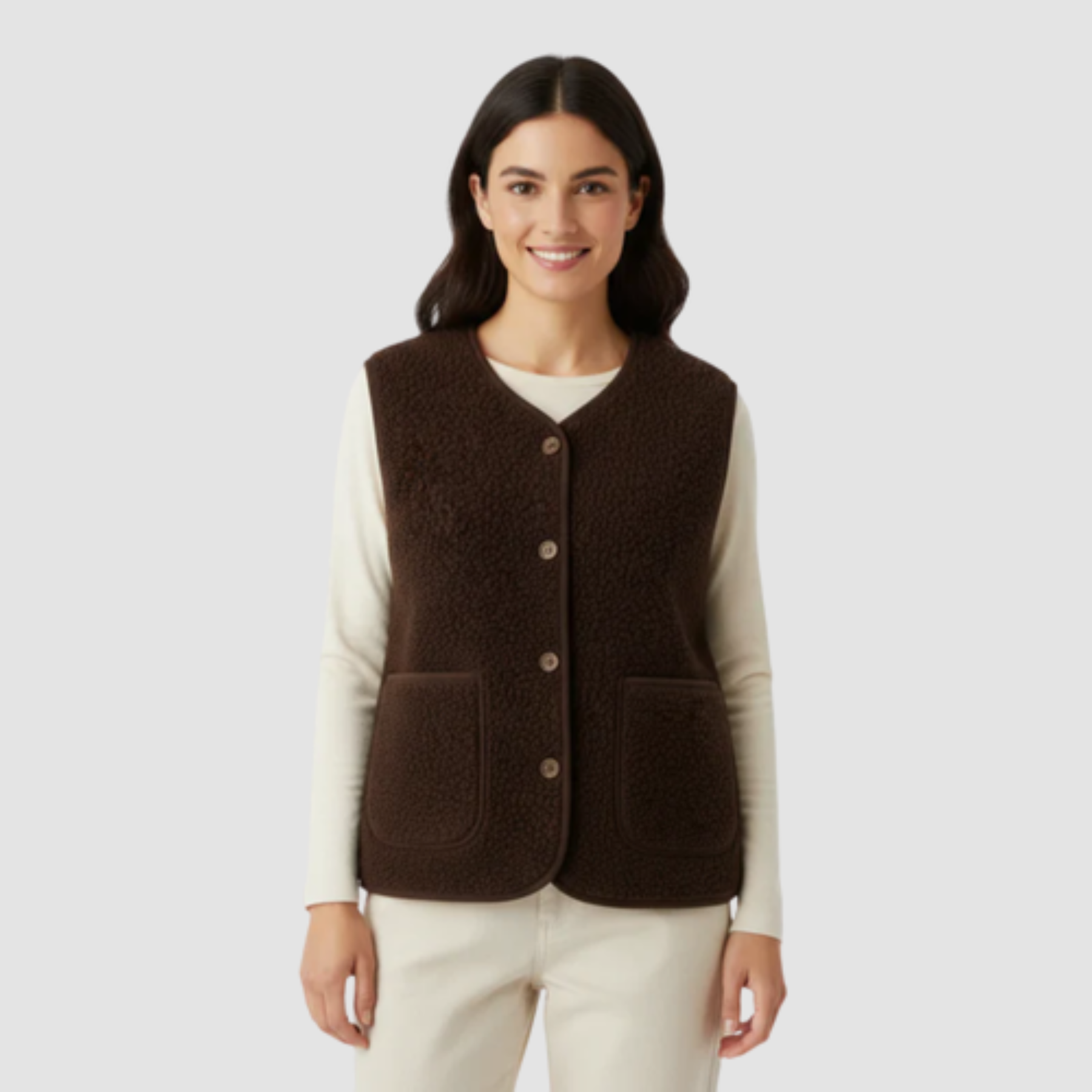 El chaleco EULALIA de MANIORÈ combina funcionalidad moderna con elegancia discreta. Su silueta recta y su escote en V crean una estética depurada que se adapta tanto a estilismos casuales como a conjuntos más cuidados.