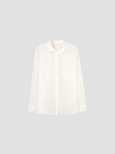 Confeccionada en un tejido liso, esta camisa presenta cuello de punta, cierre frontal de botones y un bolsillo en el pecho que aporta funcionalidad sutil. Su corte relajado pero estructurado la hace versátil, combinando con pantalones, faldas o bajo jerséis. Un básico atemporal que pasa con naturalidad de la oficina a los días casuales. Lavar a máquina en frío y secar colgada.